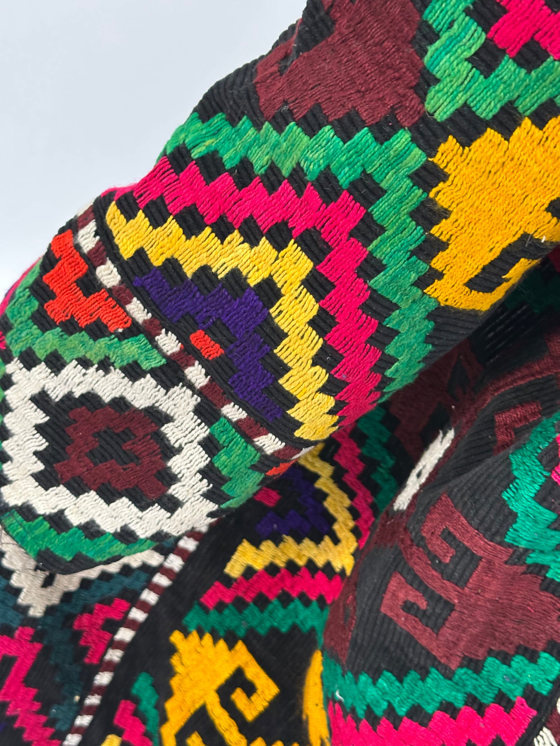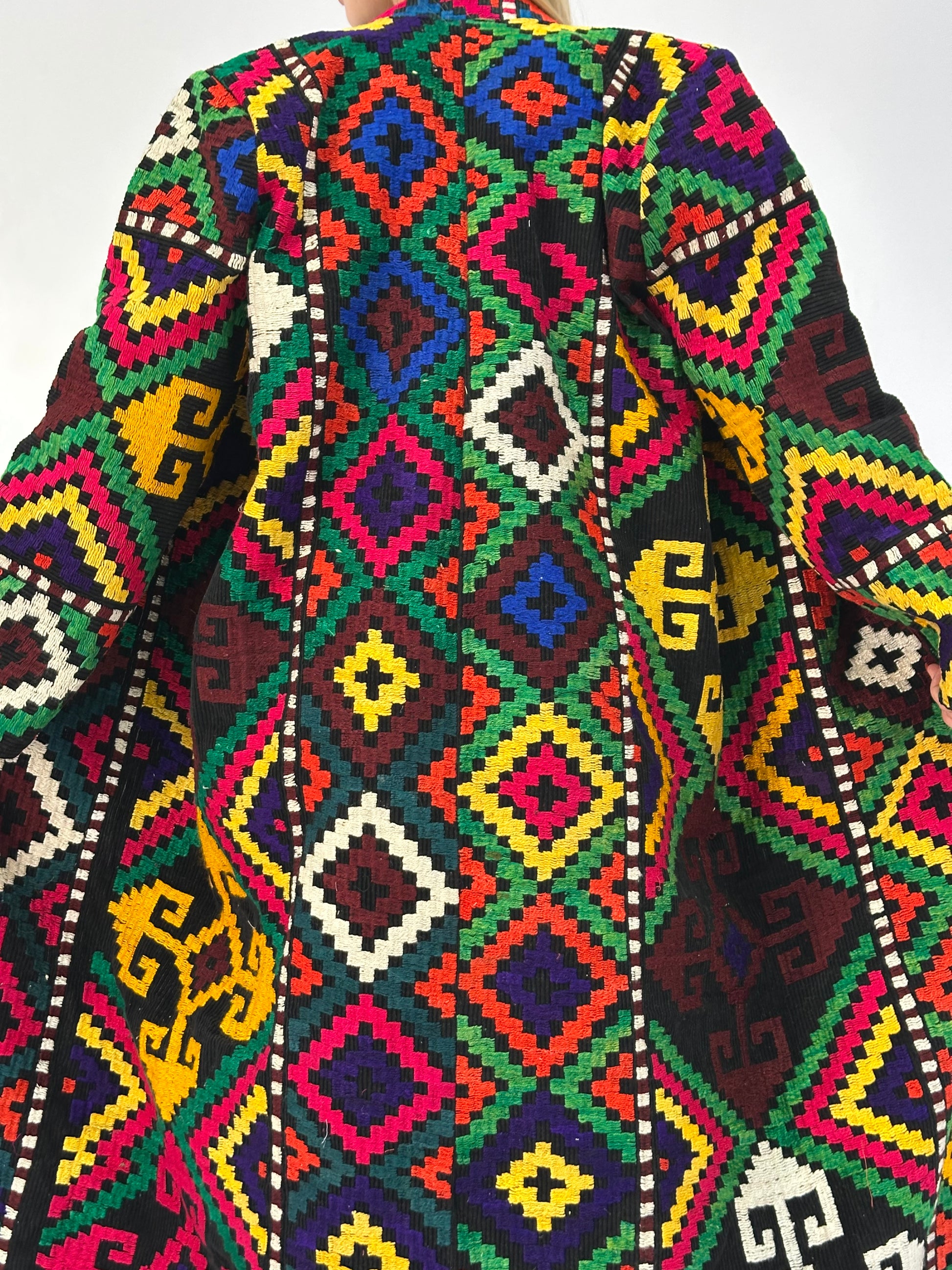 Discover our collection of vintage upcycled chapans, each one a unique treasure. Wear them as a striking coat or jacket, or drape them over your shoulders for a touch of bohemian luxury at home.