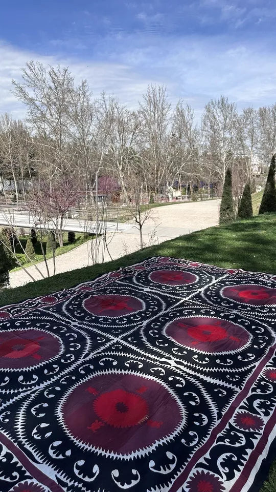 Every detail of this suzani is meticulously handcrafted using premium silk and cotton threads. The vibrant colors and intricate embroidery create a stunning tapestry that will be the centerpiece of any room.